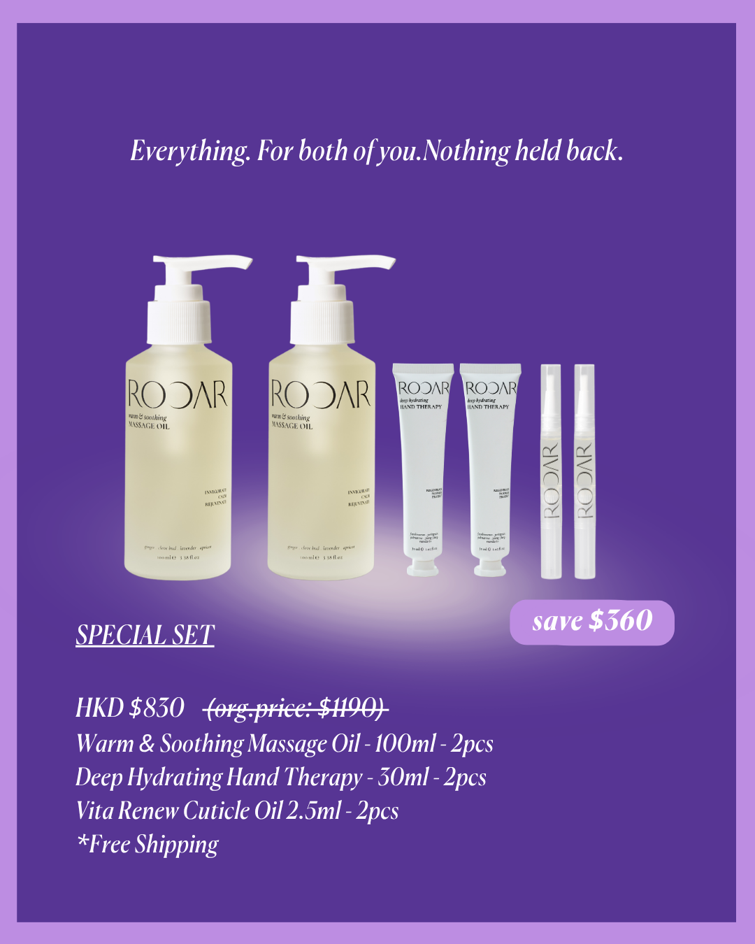 This is the one you give when words aren't enough. An evening together — ginger and clove warming deep into muscle tissue, rosehip and evening primrose restoring the skin you've both been neglecting, frankincense and gotu kola rebuilding what time has quietly taken from your hands. Body. Muscles. Hands. Nails. Every part of both of you, taken care of. This is what it means to give the most important woman in your life — and yourself — everything.